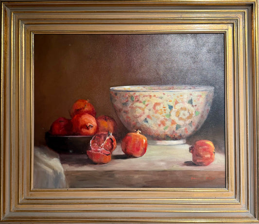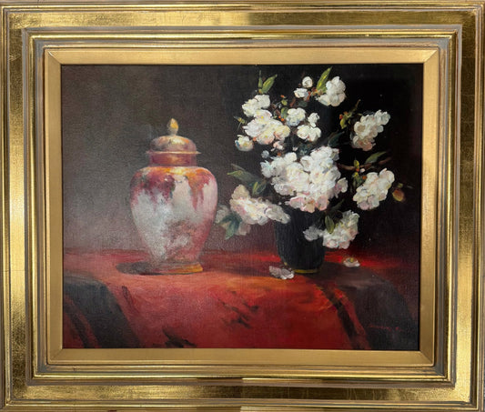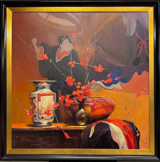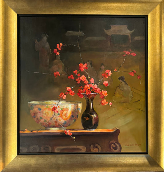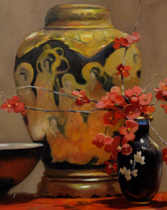 Studio work is my main preference at the moment, focusing on floral still life; but there is also the joy of painting in the landscape in any weather, or sharing a model for life work. Many of the subjects I paint incorporate beautiful pieces of art, sculpture and prints. Many were collected in Japan when my family lived there and I was a small child, others have been collected by my husband who is an inveterate collector. The blossoms and flowers grow in our garden outside Melbourne. Altogether, a happy circumstance.