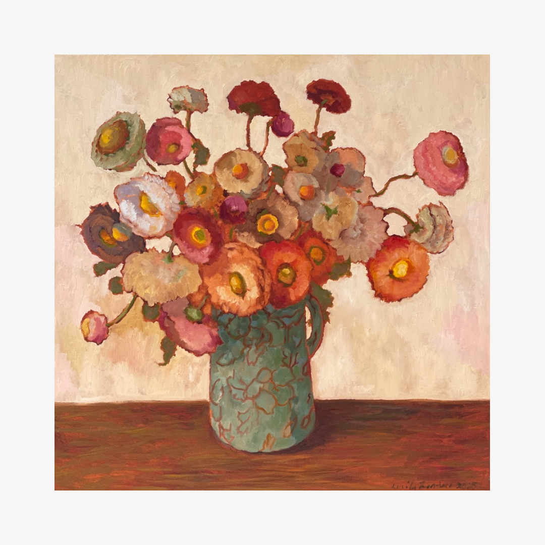 Lucila is an Australian oil painter of bright painterly florals, landscapes, portraits (Archibald finalist 2025) and an evolving series of kangaroo-masked family members (including one of her daughter in 2022 Salon des Refuses).